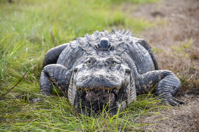 科學家為研究短吻鱷為其佩戴“ 小禮帽”追蹤設備