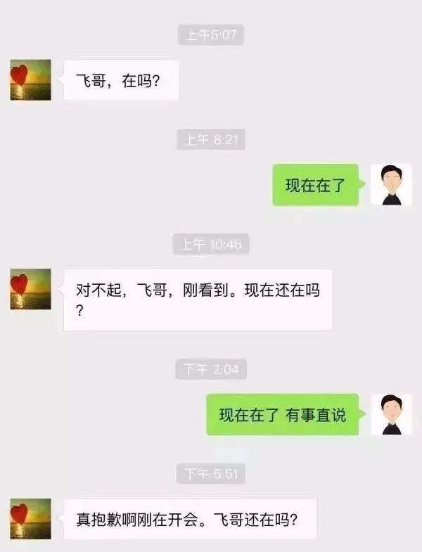 另一方面,當(dāng)你問對方有什么事時,如果對方暫時不在,隔了一會兒,又會回復(fù)你,這下在了,你還在嗎?這樣一來二去,還沒說到正題時,你已經(jīng)崩潰了。