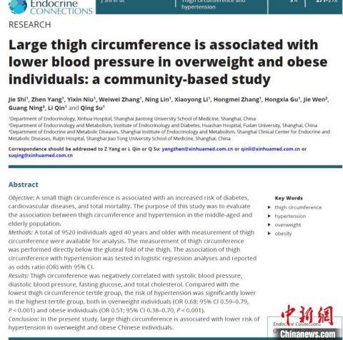 新華醫(yī)院21日披露,該院內(nèi)分泌科蘇青教授和楊振教授組成的研究小組在對近萬人進行的社區(qū)流行病學(xué)調(diào)查中發(fā)現(xiàn),與大腿較瘦的人群相比,他們屬于超重和肥胖人群。然而,大腿粗壯的人患高血壓的風(fēng)險降低了近30%和50%。